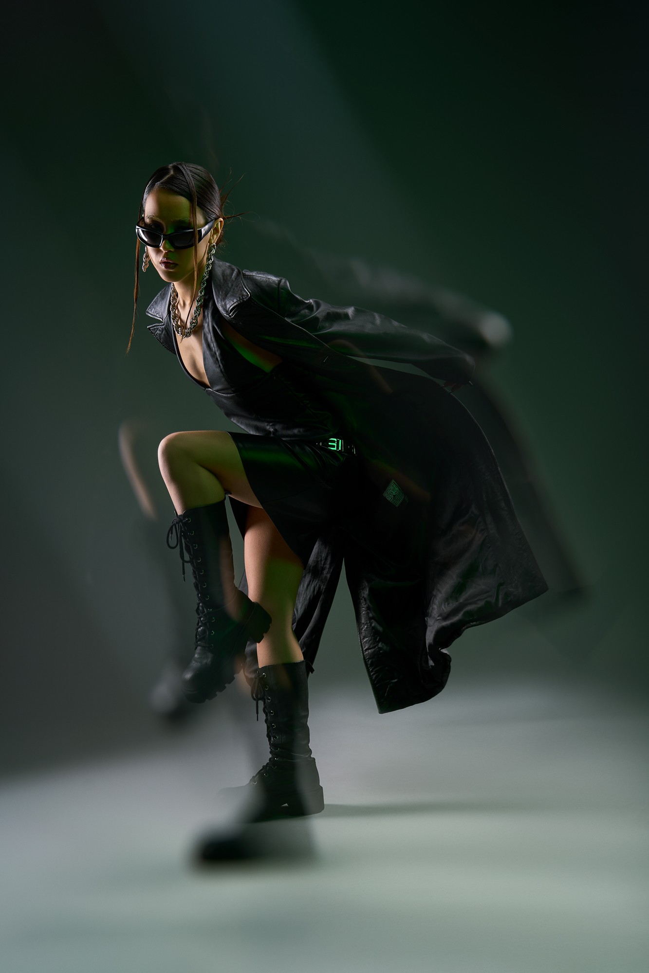 This project was inspired by The Matrix and created for Izzy’s brand, Screen Style, a vintage and second-hand clothing label influenced by iconic films and TV shows. Drawing directly from the film’s visual language, I incorporated green lighting to reference the Matrix code, alongside deliberate posing and dramatic contrast to build a cinematic mood. A lens attachment was used to introduce ghosting and light distortions, enhancing a sense of digital interference and “glitch in the Matrix” energy. The shoot explores how cinematic influence, lighting, and in-camera effects can be combined to create narrative-driven fashion imagery.